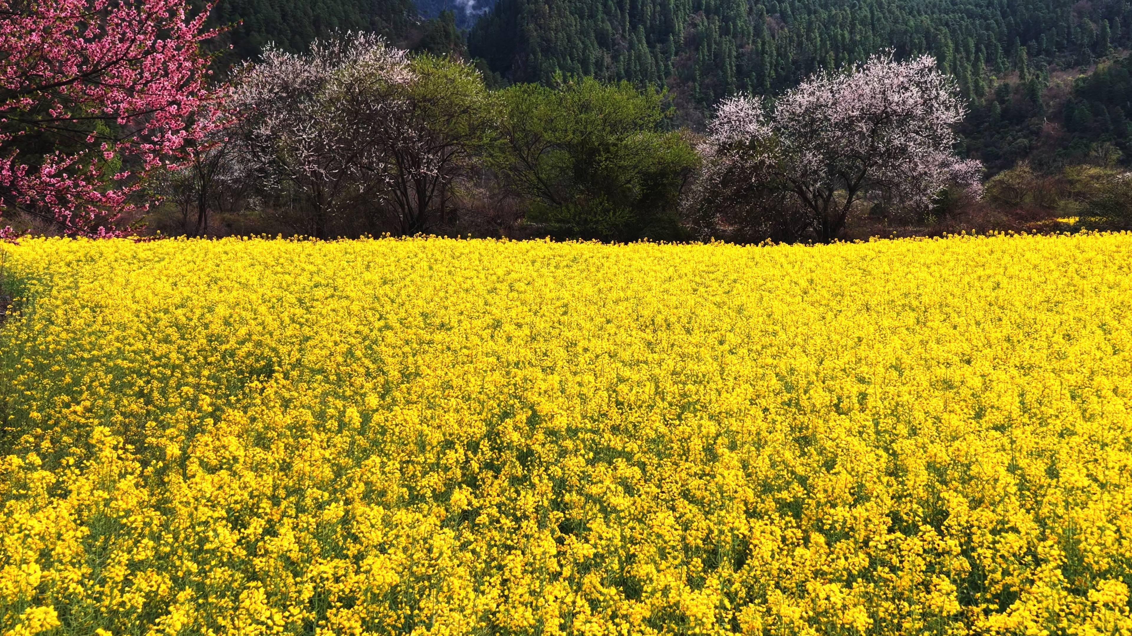西藏林芝市波密县易贡乡,油菜花与桃花迎春绽放。新华社记者 普布次仁 摄高原的春天,不止于遍野的花色,还在于不期而遇的春雪。